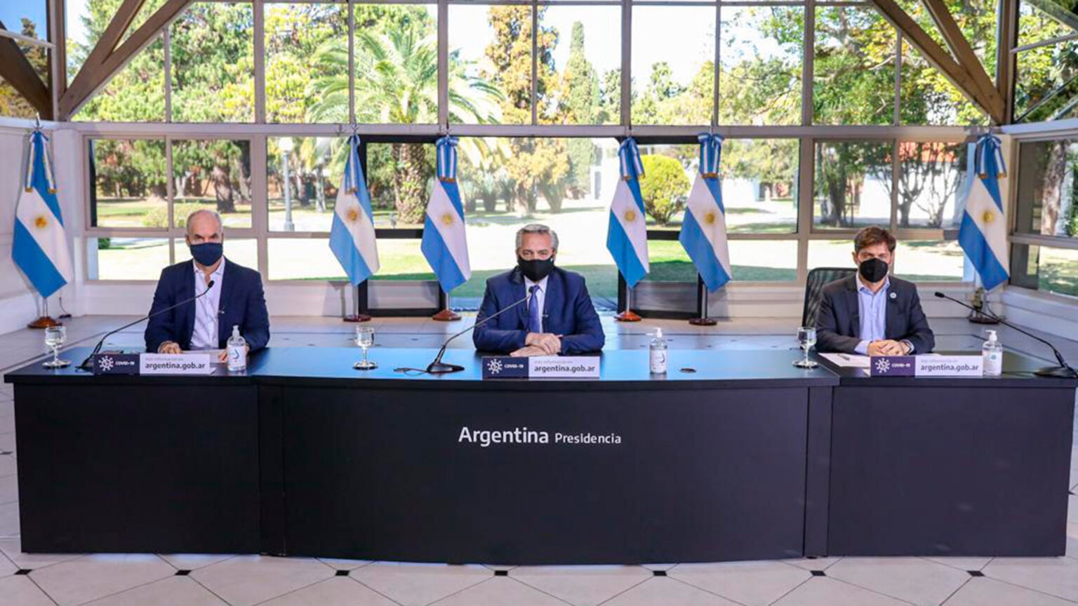 Luego de 147 días de cuarentena, el presidente Alberto Fernández extendió hasta el 30 de agosto las medidas restrictivas en el marco de la pandemia por coronavirus. En un mensaje transmitido en vivo desde la Quinta de Olivos, donde estuvo acompañado por el jefe de Gobierno de la Ciudad de Buenos Aires, Horacio Rodríguez Larreta, y el gobernador bonaerense, Axel Kicillof, aseguró: “El problema ya no es en el AMBA, el problema se ha diseminado por todo el país y por eso hay que potenciar todos los cuidados”.