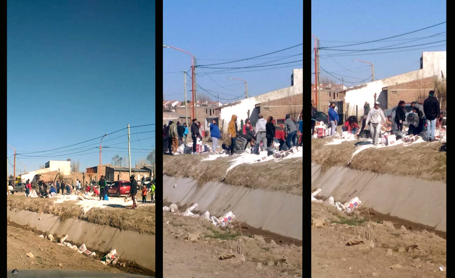 Una vez que se retiró la unidad llevandose las bolsas que no se rompieron. La gente se acercó con recipientes para retirar la harina que quedó esparcida en la calle.