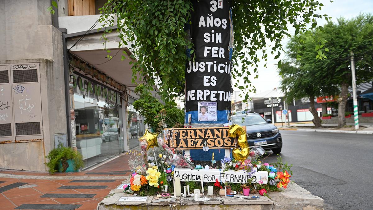 Un letrero de madera con el nombre de Fernando Báez Sosa cubierto con estampitas, flores, rosarios y cartas es la postal del lugar donde hace tres años el joven estudiante de abogacía fue asesinado a golpes por un grupo de ocho rugbiers que ahora es juzgado por el homicidio.