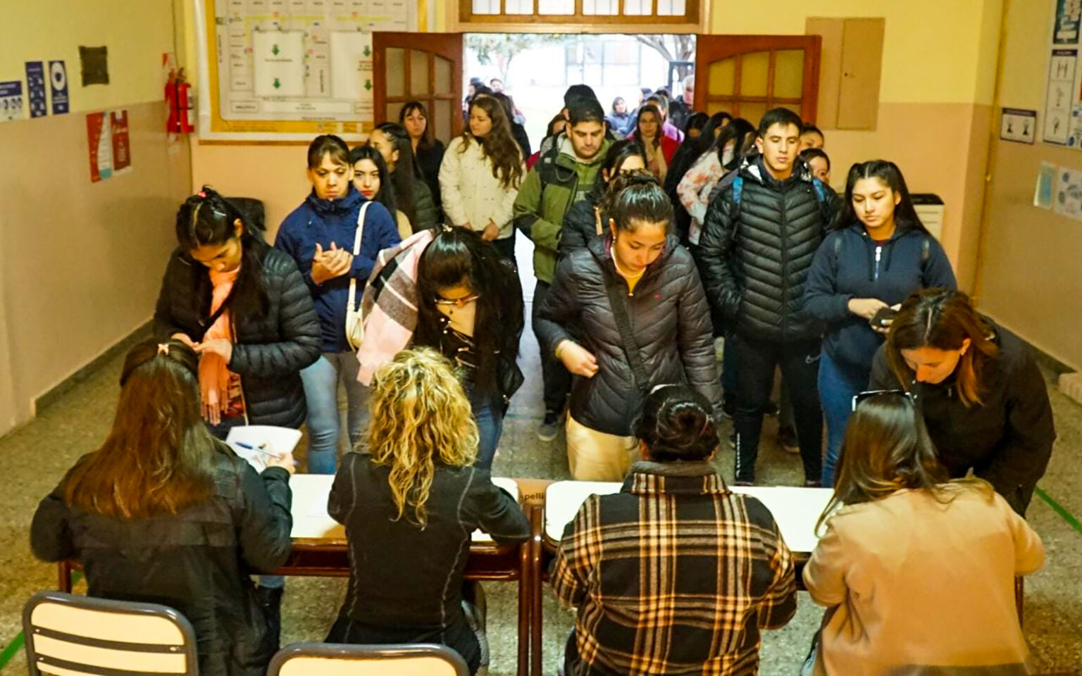 En la previa al examen se observó una larga fila de jóvenes que aguardaban pacientes su oportunidad para rendir. Allí fueron visitados por el Intendente Carlos Koopmann, quien observó por unos instantes el proceso en las aulas.