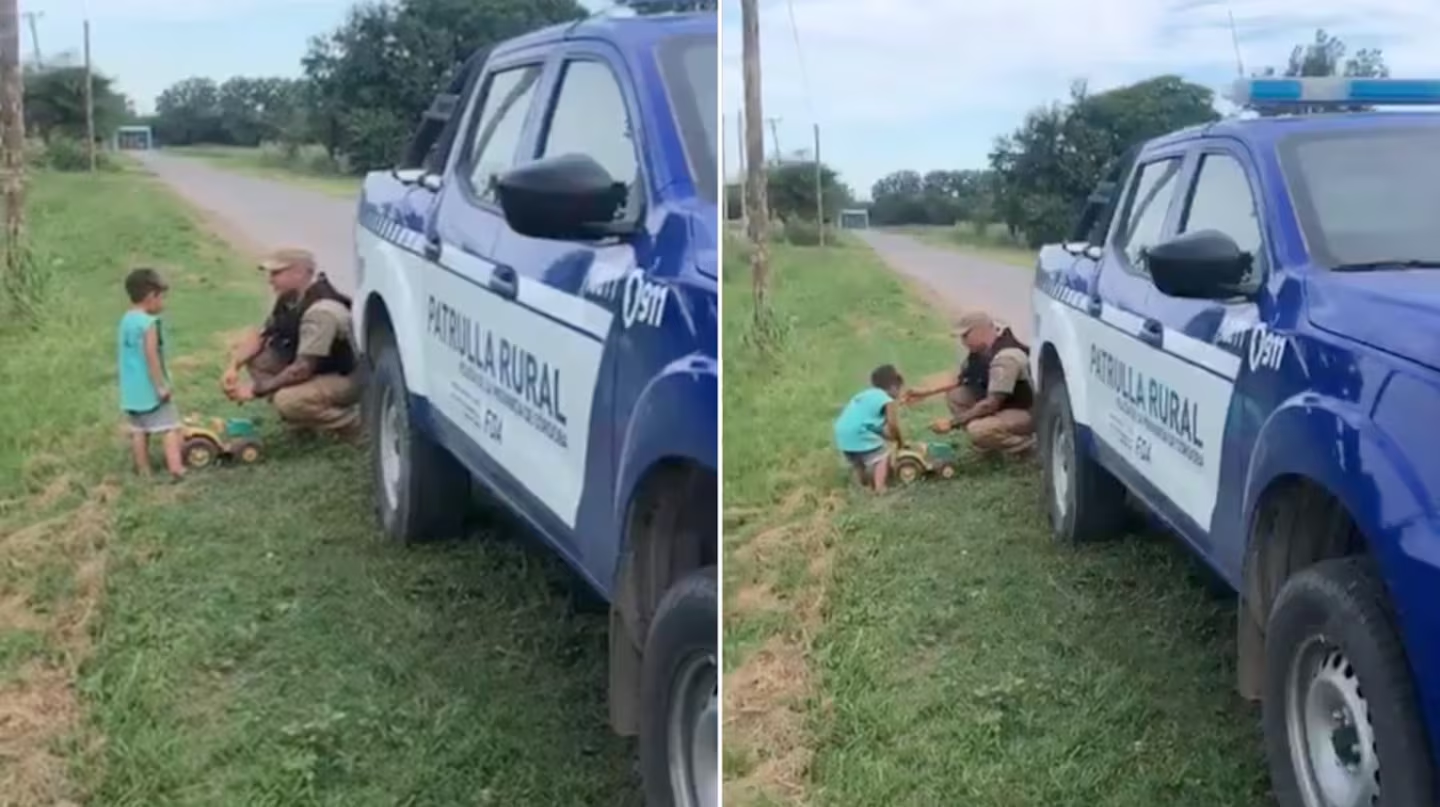 En un video difundido por las redes sociales oficiales de la Policía de la provincia de Córdoba, se observa al personal de la Patrulla Rural junto al chiquito. El nene tenía en la mano un camión de juguete con el que se distrajo cuando se alejó de su casa.