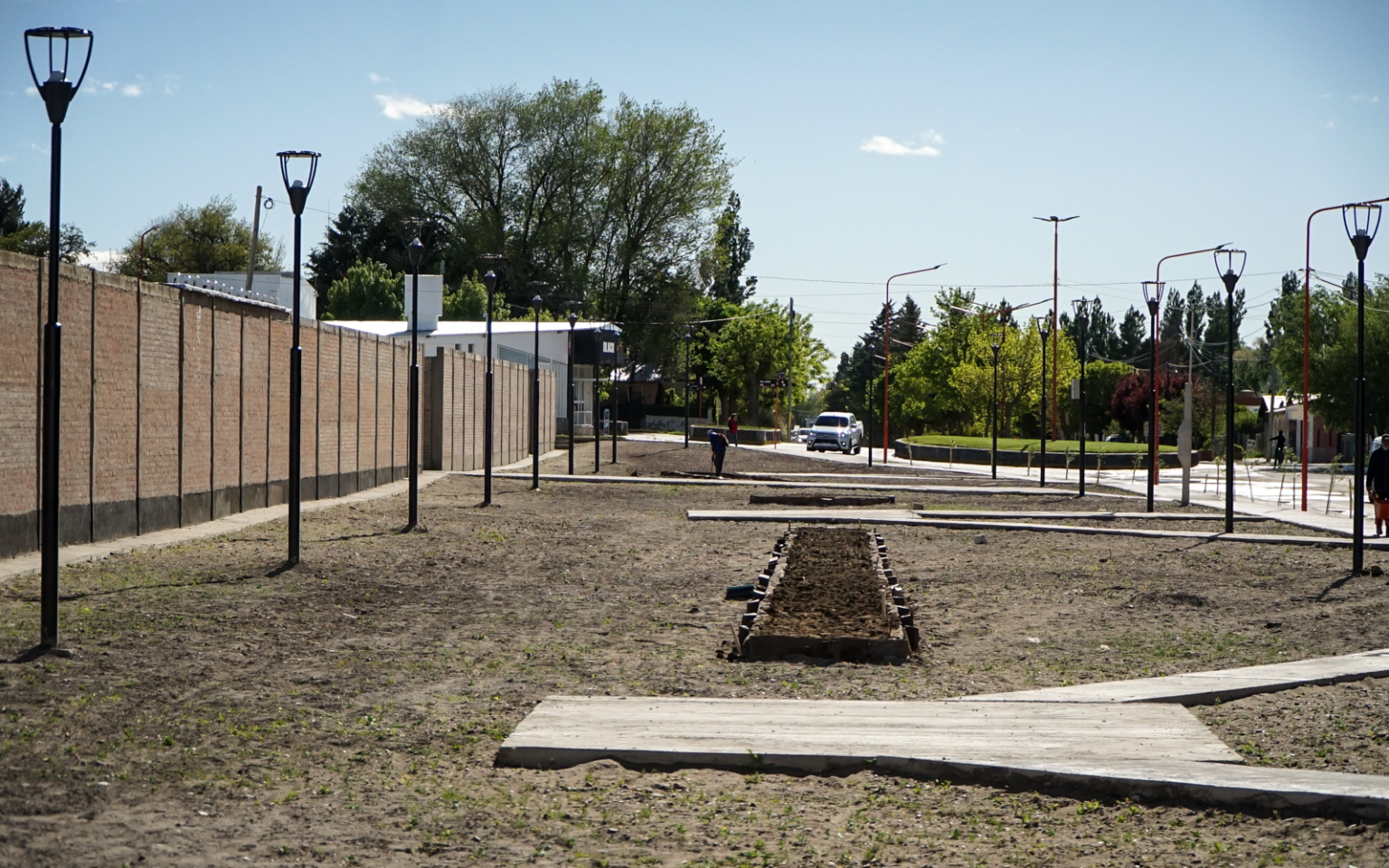 Allí se proyecto el “Paseo de la Paz”, que será un espacio verde, con mobiliario urbano y su correspondiente iluminación. Según datos oficiales, luego de la finalización del cableado subterráneo, se instalaron 23 luminarias LED. Además, luego de la construcción de las veredas ya se analiza el momento óptimo del año para el parquizado.