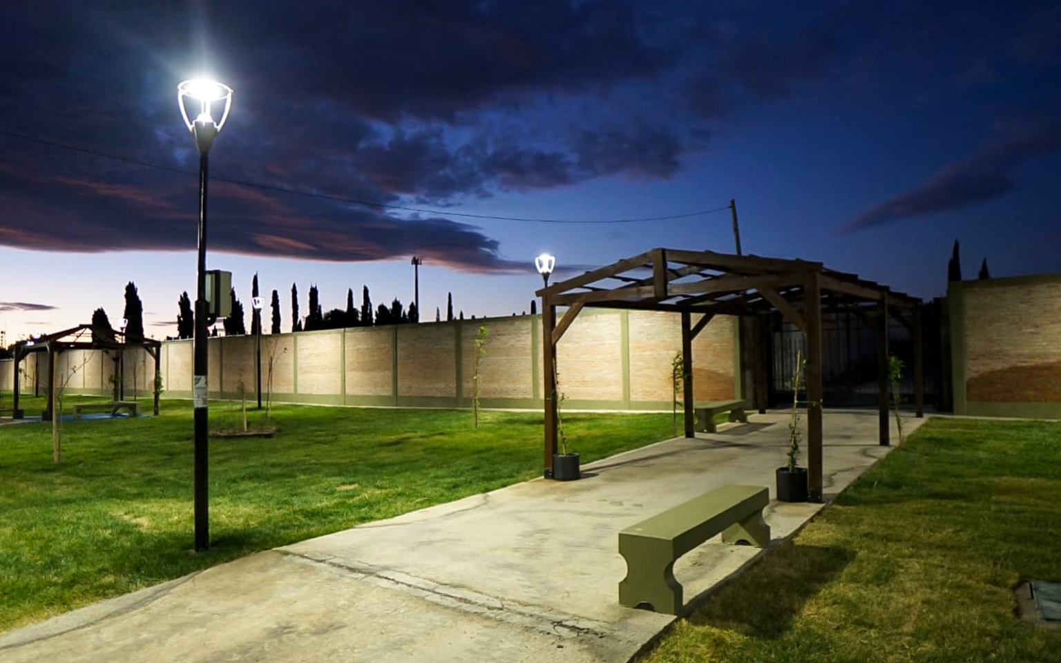 A mediados de año, y en paralelo con una serie de obras en el interior del cementerio, el Municipio inició con la instalación del riego por toberas, para luego concretar la colocación de 2500 metros cuadrados de champas. Allí mismo, se procedió a construir veredas internas, que permiten llegar a los vecinos y vecinas hasta una de las cuatro pérgolas montadas.