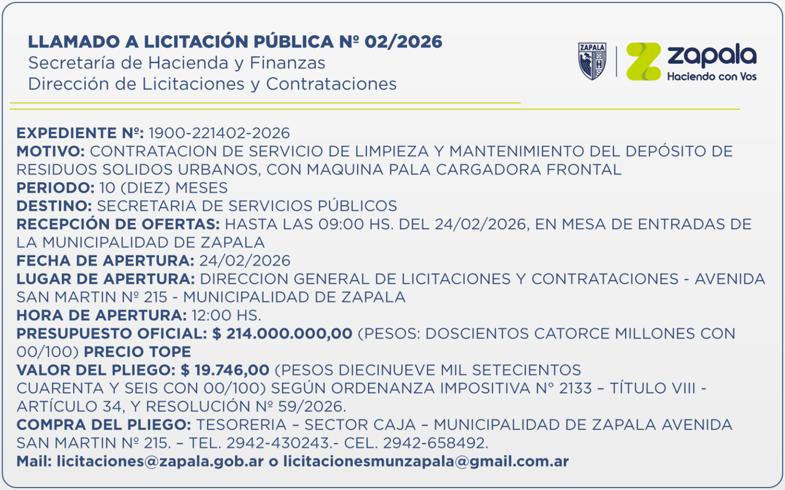 Para más información, los interesados pueden comunicarse a los siguientes contactos: licitaciones@zapala.gob.ar o licitacionesmunzapala@gmail.com, o bien llamar a los teléfonos 2942-430243 y 2942-658492.