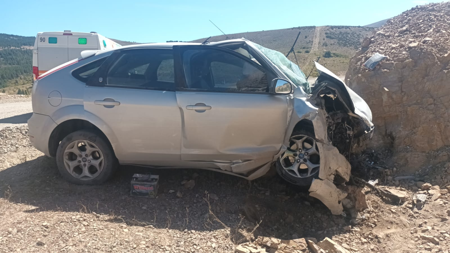 Horas más tarde, minutos antes de las 15, se produjo otro grave siniestro sobre la misma ruta, esta vez a la altura de la estancia San Ramón. Un matrimonio que viajaba en un Ford Focus desde Pilcaniyeu hacia Dina Huapi perdió el control del vehículo, que derrapó y terminó impactando de lleno contra una roca de gran tamaño al costado del camino.