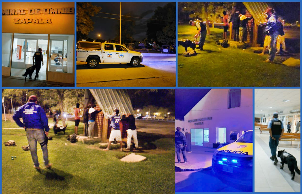 Uniformados de la División Antinarcóticos Junín de los Andes, realizó tareas de seguridad preventiva en la terminal de ómnibus de San Martín de los Andes, mientras que efectivos de la División Antinarcóticos Zapala, implementaron controles en la Terminal de Ómnibus, Paseo La Estación, plaza Puerto Argentino, Don Bosco y Plaza Pino Azul