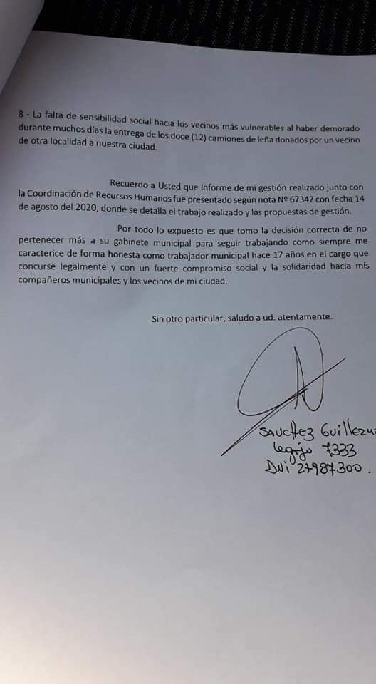 Según la nota que presentó justificando su renuncia, en la misma Sanchez aduce la falta de acción política e improvisación para coordinar las asistencias necesarias; las denuncias públicas sobre los fondos depositados en la cuenta de una funcionaria sin ningún tipo de respaldo.