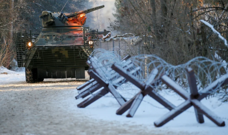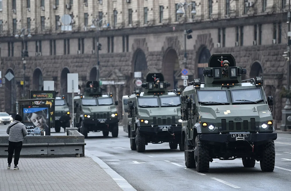 Vehículos militares rusos pasan por una calle después de que el presidente Vladimir Putin autorizó una operación militar en el este de Ucrania, en la localidad de Armyansk, Crimea, Febrero 24, 2022. REUTERS/Stringer