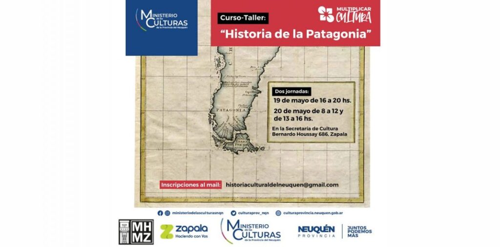 En el ámbito del programa Multiplicar Cultura, el Ministerio de las Culturas organiza el curso-taller de capacitación “Historia de la Patagonia”, que se desarrollará el 19 y 20 de mayo en la Secretaría de Cultura de Zapala.
