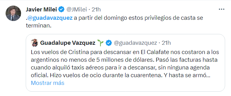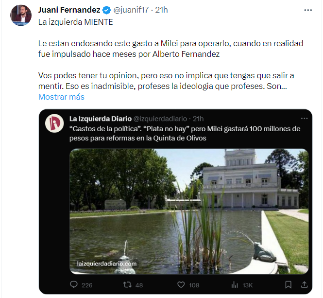 El mismo Javier Milei retuiteo al economista Juani Fernandez, autor del libro Libertad Para Gente Inteligente, quien le contestó a La Izquierda Diario sobre una información que decia Milei gastaría 100 millones de pesos para reformas en la Quinta de Olivos.