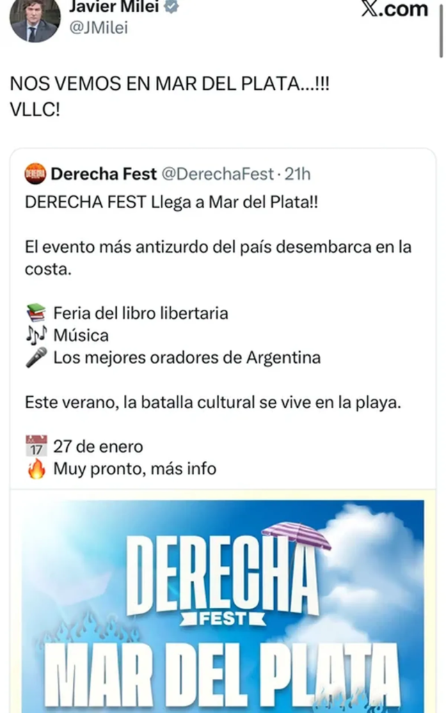 Por otro lado, Javier Milei confirmó a través de sus redes sociales que participará a fines de enero en una nueva edición del festival Derecha Fest, que se realizará el 27 de enero en la ciudad balnearia de Mar del Plata.